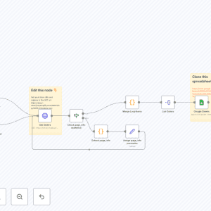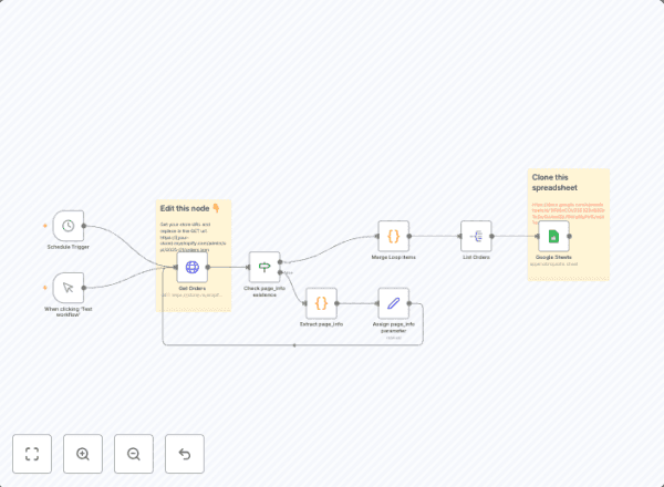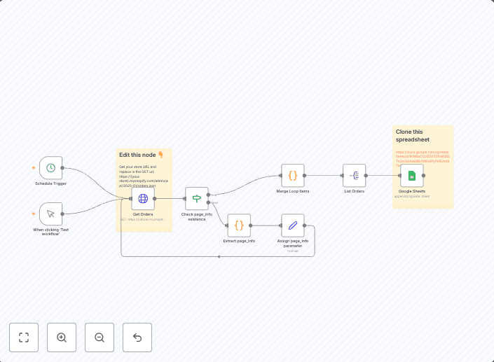 This workflow retrieves all Shopify Orders and saves them into a Google Sheets spreadsheet using the Shopify Admin REST API. It uses pagination to ensure all orders are collected efficiently.